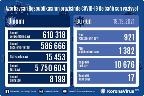Azərbaycan Respublikasında koronavirus (COVID-19) infeksiyasına 921 yeni yoluxma faktı qeydə alınıb, 1 382 nəfər müalicə olunaraq sağalıb.