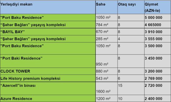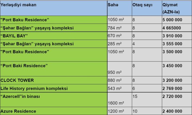 Bakıda satılan ən bahalı mənzil isə "Port Baku Residence”də yerləşən 1050 m²-lik 8 otaqlı “penthaus”dur. Qiyməti 5 milyon manatdır.