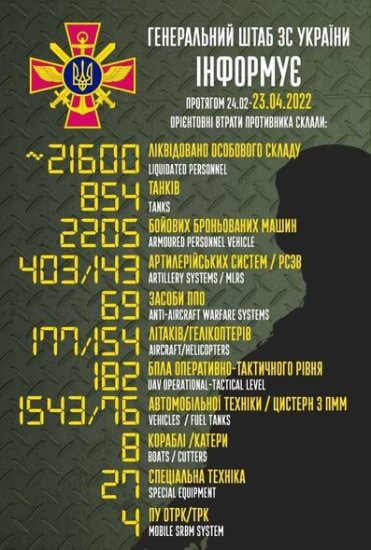 Gedən döyüşlərdə Rusiya ordusunun 854 tankı, 2205 zirehli döyüş maşını, 403 artilleriya sistemi, 143 reaktiv yaylım atəş sistemi, 69 HHM sistemi, 177 təyyarəsi, 154 helikopteri, 1 543 avtomobil texnikası, səkkiz gəmisi, 76 yanacaq-sürtkü materialları çəni, 182 kəşfiyyat PUA-sı, 27 xüsusi texnikası, dörd əməliyyat-taktiki raket kompleksi məhv edilib.