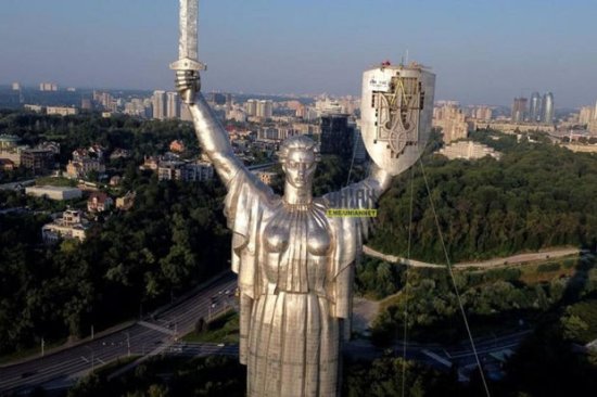 Avropanın ən hündür abidələrindən olan “Ana Vətən”in qalxanındakı sovet gerbi Ukraynanın milli simvolu üçdişli mizraqla (“Trezub”) əvəzlənib.