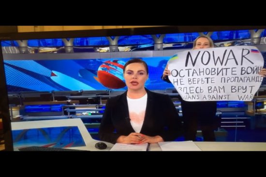 APA xəbər verir ki, "Pervıy kanal"ın efirində "Vremya" xəbərlər proqramının yayımı zamanı aparıcının arxasında əlində plakat tutan qız peyda olub.