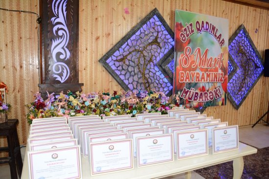 Çıxışının sonunda rayon rəhbəri tədbirin təşkilinə etdiyi köməkliyə görə “Vəkiloğlu” MMC-nin rəhbərliyinə minnətdarlığını bildirib. Daha sonra Azərbaycan Respublikasının sabiq İnsan hüquqları üzrə müvəkkili, kimya elmləri doktoru, professor, Azərbaycan Respublikası Prezidentinin fərdi təqaüdçüsü, Alim, dövlət və ictimai xadim Elmira Süleymanova çıxış edərək əccəlcə 8 Mart - Beynəlxalq Qadınlar Günü münasibətilə bütün qadınları təbrik edib, onlara xoşbəxtlik, möhkəm cansağlığı və işlərində müvəffəqiyyətlər diləyib. Sonra Azərbaycan Respublikasının Prezidenti cənab İlham Əliyevin 8 Mart - Beynəlxalq Qadınlar Günü münasibətilə Azərbaycan qadınlarına ünvanladığı təbrikini oxuyub. Ölkəmizdə uğurla həyata keçirilən dövlət qadın siyasətindən danışıb. Azərbaycan qadınının bu gün həyatımızın bütün sahələrində ləyaqətlə təmsil olunduqlarını, müstəqil respublikamızın inkişafına öz layiqli töhfələrini verdiklərini diqqətə çatdırıb. Kimya üzrə elmlər doktoru, akademik, Azərbaycan Milli Elmlər Akademiyasının həqiqi üzvü, AMEA-nın akademik Yusif Məmmədəliyev adına Neft-Kimya Prosesləri İnstitutunun direktoru Vaqif Abbasov çıxış edərək 8 Mart - Beynəlxalq Qadınlar Günü münasibətilə başda şəhid anaları olmaqla bütün Azərbaycan qadınlarını təbrik edib, dövlətimiz tərəfindən şəhid ailələrinə göstərilən diqqət və qayğıdan danışıb. Bu gün Azərbaycan qadını cənab Prezident İlham Əliyev və Azərbaycan Respublikasının Birinci vitse-prezidenti Mehriban xanım Əliyevanın diqqəti və qayğısı sayəsində ölkənin ictimai-siyasi, sosial-iqtisadi və intellektual-mənəvi həyatında yaxından iştirak etdiklərini bildirib.