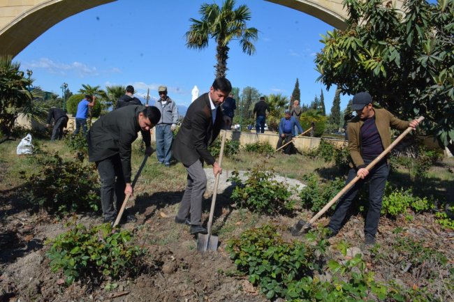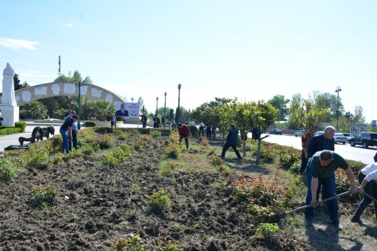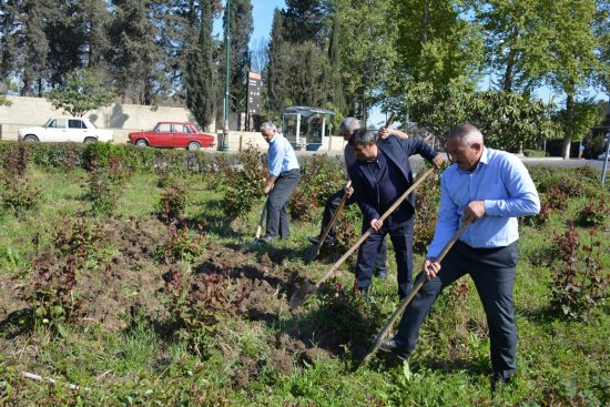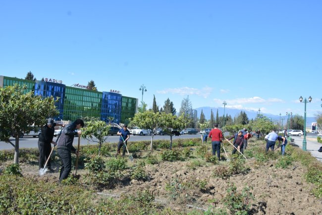 Əvvəlcə ərazidə təmizlik işləri aparılıb, ağacların dibləri və köhnəlmiş qazon hissələr yenidən səpilməsi üçün bellənib, səliqə-səhman yaradılıb.