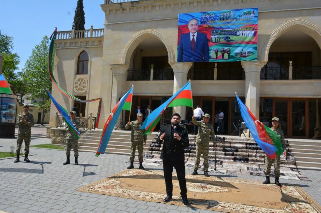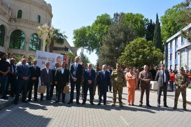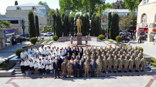 Tədbirdə iştirak edən rayon icra hakimiyyətinin başçısı Müstəqim Məmmədov çıxış edərək Ümummilli Liderin 100 illik yubileyi münasibəti ilə rayonda keçirilən silsilə tədbirlərdən, Ulu Öndərin hakimiyyəti illərində rayonun sosial–iqtisadi inkişafından, dövlətçiliyimizin qorunub saxlanması istiqamətində Heydər Əliyevin göstərdiyi gərgin siyasi fəaliyyətdən, Ulu Öndərin Vətən və millət üçün gördüyü genişmiqyaslı işlərdən, ölkəmizin həqiqətlərinin dünya ictimaiyyətinə çatdırılmasındakı müstəsna xidmətlərindən danışıb. Qeyd edib ki, Azərbaycan Ordusunun müasir, müstəqil dövlətimizin qurucusu olan Ulu Öndər formalaşdırıb. Qarşısına qoyulan hər hansı tapşırığı yüksək səviyyədə yerinə yetirmək iqtidarına malik olan Azərbaycan Silahlı Qüvvələri bu gün NATO standartlarına cavab verən səviyyədədir. Ümummilli Liderin mahir diplomatiyası və uzaqgörən siyasəti nəticəsində yaradılan C.Naxçıvanski adına hərbi məktəb Azərbaycan müstəqilliyini bərpa etdikdən sonra, ordu quruculuğunda əsas bazalardan birinə çevrilib. Ümummilli Lider deyirdi: “Biz C.Naxçıvanski adına Hərbi Litseyin ilk bünövrə daşlarını qoyanda o bizim üçün nəzəriyyə deyirdi, böyük gələcəyə, Azərbaycanın gələcəyinə baxış idi. Azərbaycanın milli zabit kadrlarının hazırlanması üçün ilk uğurlu addımlar idi”.