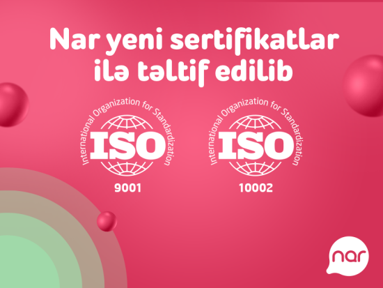 "Nar" müştəriyönümlülük strategiyasının beynəlxalq səviyyədə tanınması ilə daha bir uğura imza atdı. Mobil operator ISO 9001:2015 Keyfiyyətin İdarə olunması və ISO 10002:2018 Müştəri Məmnuniyyətinin İdarə olunması üzrə beynəlxalq sertifikatlara layiq görülüb. Qiymətləndirilmə aparıcı beynəlxalq yoxlama və sertifikatlaşdırma şirkəti olan “Bureau Veritas Group” tərəfindən aparılıb. “Nar” müştərilərinə etibarlı şəkildə yüksək keyfiyyətli xidmətlər təqdim etmək öhdəliyini davamlı şəkildə nümayiş etdirərək Beynəlxalq Standartlaşdırma Təşkilatının meyarlarına cavab verib.