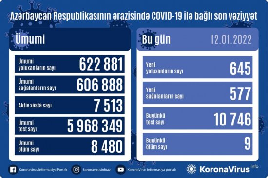 Azərbaycan Respublikasında koronavirus (COVID-19) infeksiyasına 645 yeni yoluxma faktı qeydə alınıb, 577 nəfər müalicə olunaraq sağalıb.