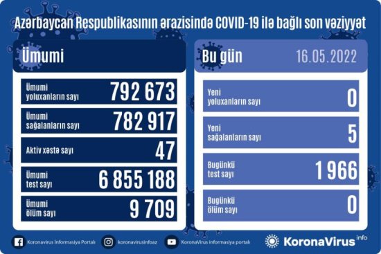 Azərbaycan Respublikasında koronavirus (COVID-19) infeksiyasına yeni yoluxma faktı qeydə alınmayıb, 5 nəfər müalicə olunaraq sağalıb.