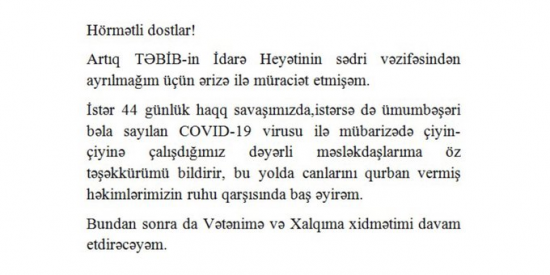Artıq TƏBİB-in İdarə Heyətinin sədri vəzifəsindən ayrılmağım üçün ərizə ilə müraciət etmişəm. İstər 44 günlük haqq savaşımızda, istərsə də ümumbəşəri bəla sayılan COVID-19 virusu ilə mübarizədə çiyin-çiyinə çalışdığımız dəyərli məsləkdaşlarıma öz təşəkkürümü bildirir, bu yolda canlarını qurban vermiş həkimlərimizin ruhu qarşısında baş əyirəm.