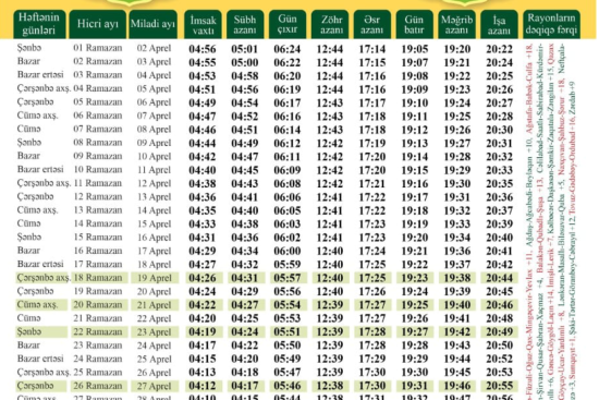 Qeyd edək ki, Ramazan ayı Azərbaycanda aprelin 2-də başlayacaq. Şəvval ayının 1-i, yəni mayın 2-də Ramazan (Fitr) bayramı olacaq.