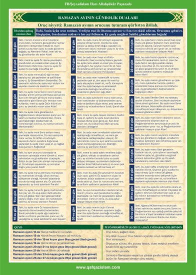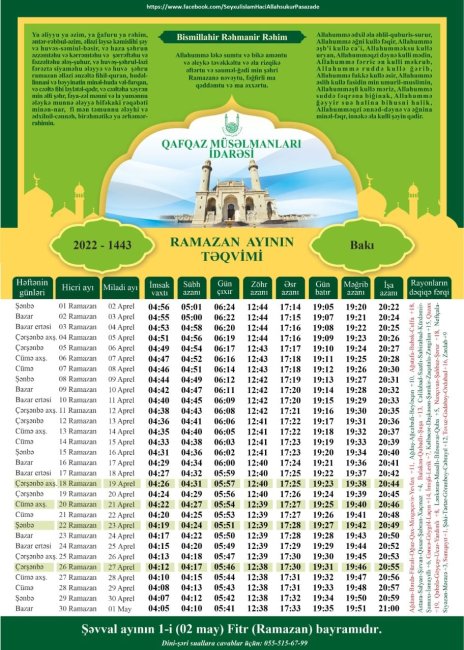 APA xəbər verir ki, bu barədə Qafqaz Müsəlmanları İdarəsinin Ramazan ayının gündəlik duaları, imsak-iftar vaxtlarını əks etdirən xüsusi təqvimində qeyd edilib.