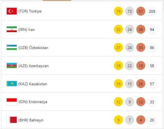 İlk üç mövqedə medal əyarında müvafiq olaraq, Türkiyə 209 (79 qızıl, 73 gümüş, 57 bürünc), İran 94 (32 qızıl, 24 gümüş, 38 bürünc) və Özbəkistan 86 (27 qızıl, 24 gümüş, 35 bürünc) medalla qərarlaşıb.