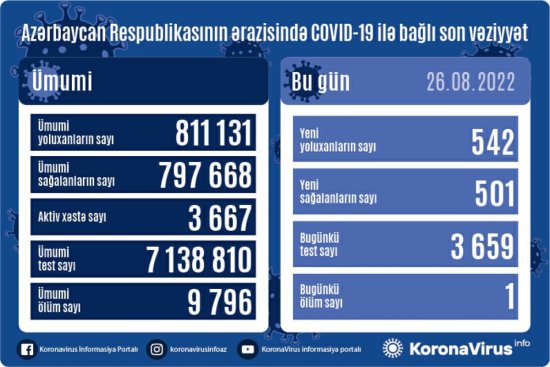 Azərbaycan Respublikasında koronavirus (COVID-19) infeksiyasına 542 yeni yoluxma faktı qeydə alınıb, 501 nəfər müalicə olunaraq sağalıb.
