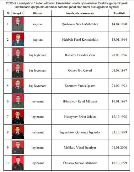 Ermənistan silahlı qüvvələrinin törətdiyi təxribatların qarşısının alınması zamanı şəhid olan hərbi qulluqçuların siyahısı