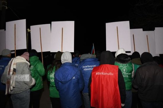 “Report”un aksiyanı işıqlandıran əməkdaşı xəbər verir ki, ekofəallar və gənc könüllülər dəyişməz şüarları ilə Azərbaycan cəmiyyətinin haqlı narazılığını dilə gətirir, ekoloji terrora son qoyulmasını, faydalı qazıntı yataqlarının qanunsuz istismarının dayandırılmasını tələb edirlər.