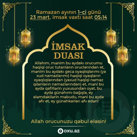 Qafqaz Müsəlmanları İdarəsinin açıqladığı Ramazan təqviminə əsasən, martın 23-də imsak vaxtı saat 05:14-də, iftar vaxtı isə saat 19:09-dadır.