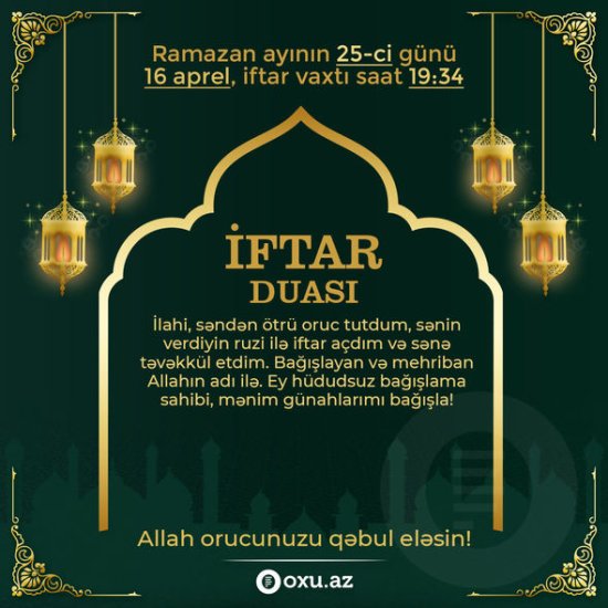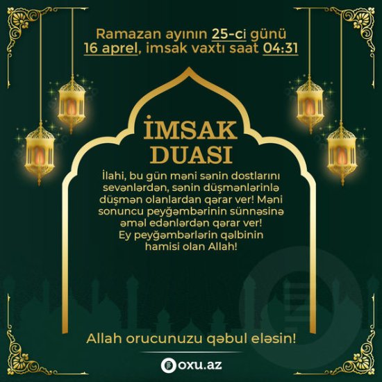 Qafqaz Müsəlmanları İdarəsinin açıqladığı Ramazan təqviminə əsasən, aprelin 16-da imsak vaxtı saat 04:31-də, iftar vaxtı isə 19:34-dədir.