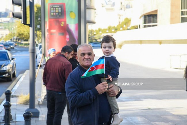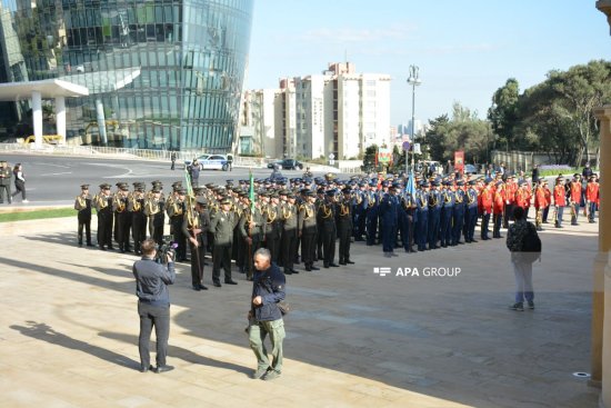 Vertikal.az APA-ya istinadla xəbər verir ki, hərbi orkestrin müşayiəti ilə təşkil olunan yürüşdən əvvəl şəhidlərin ruhu bir dəqiqəlik sükutla yad edilib.