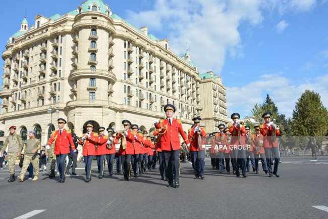 Orkestrlər marşlar, hərbi vətənpərvərlik mahnıları səsləndiriblər.