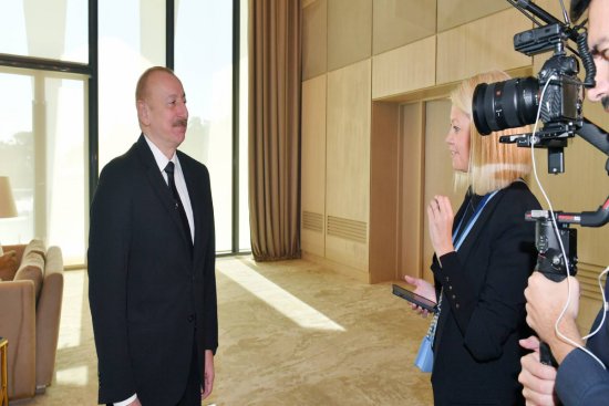 Prezident İlham Əliyev: Bəli, əlbəttə. Bu işdə bir qədər mövzu dəyişilməlidir. Çünki qazıntı yanacağına sahib olan ölkə olmaq sözsüz ki, bizim günahımız deyil. Düşünürəm ki, bu, bizim nailiyyətimizdir ki, biz neft və qaz ehtiyatları olan bir çox ölkənin üzləşdiyi “neft lənətinə” düçar olmamağı bacardıq. Biz nefti inkişafa çevirdik, sərvətin ədalətli paylanmasını təmin etməyə nail olduq. Son 20 ildə biz Azərbaycanda yoxsulluğun səviyyəsini 50 faizdən 5 faizə endirdik. Sizin Bakıda bütün gördükləriniz infrastrukturun tamamilə yeni inkişafı və insanların həyat səviyyəsinin yaxşılaşmasıdır. Əfsuslar olsun, indi deyirlər ki, qazıntı yanacağı təhlükəlidir, mənfidir və günah bu ehtiyata sahib olan ölkələrdədir. Mənim mesajım ondan ibarət idi ki, bizə gördüyümüz işə görə, gəlirlərdən insanların ehtiyaclarını təmin etmək və yaşıl enerji gündəliyinə təkan vermək üçün necə istifadə etdiyimizə görə qiymət verin. Ümidvaram ki, mesajım eşidiləcək.