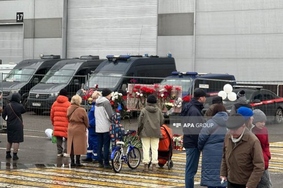Moskva sakinləri əllərində gül "Crocus City Hall"-un avtomobil dayanacağında quraşdırılan lövhəyə yaxınlaşırlar. Polis onlara maneə olmur. İnsanlar gül dəstələrini düzüb terror aktında həlak olanların yaxınlarının kədərlərini bölüşürlər.
