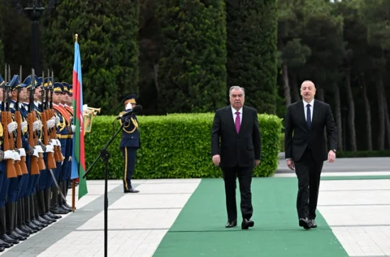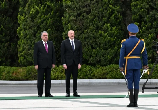 AZƏRTAC xəbər verir ki, hər iki ölkənin Dövlət bayraqlarının dalğalandığı meydanda Tacikistan Prezidentinin şərəfinə fəxri qarovul dəstəsi düzülüb.