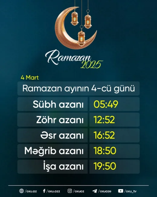 Qafqaz Müsəlmanları İdarəsinin açıqladığı Ramazan təqviminə əsasən, martın 4-də imsak vaxtı saat 05:44-də, iftar vaxtı isə 18:50-dədir.